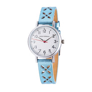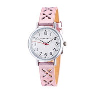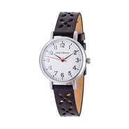 The Clover watch collection features a floral cutout patterned leather band. This unique band is paired with a brushed silver watch case and mirrored full numbered dial for a dressy casual finish.