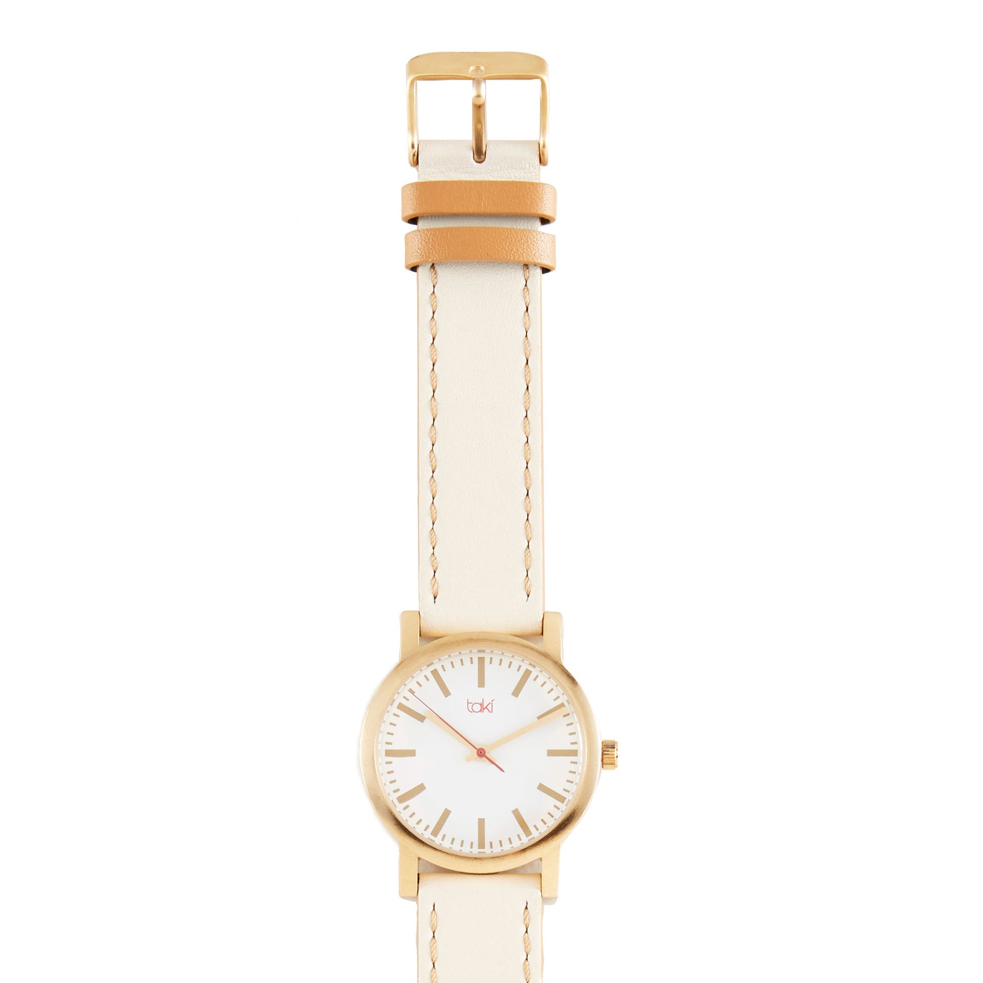 The Eden watch collection features a muted and neutral pastel color palette beautifully paired with a gold brushed case and buckle. Thin accent stitching lining the watch band matches the dial color to complete the cohesive design detailing.