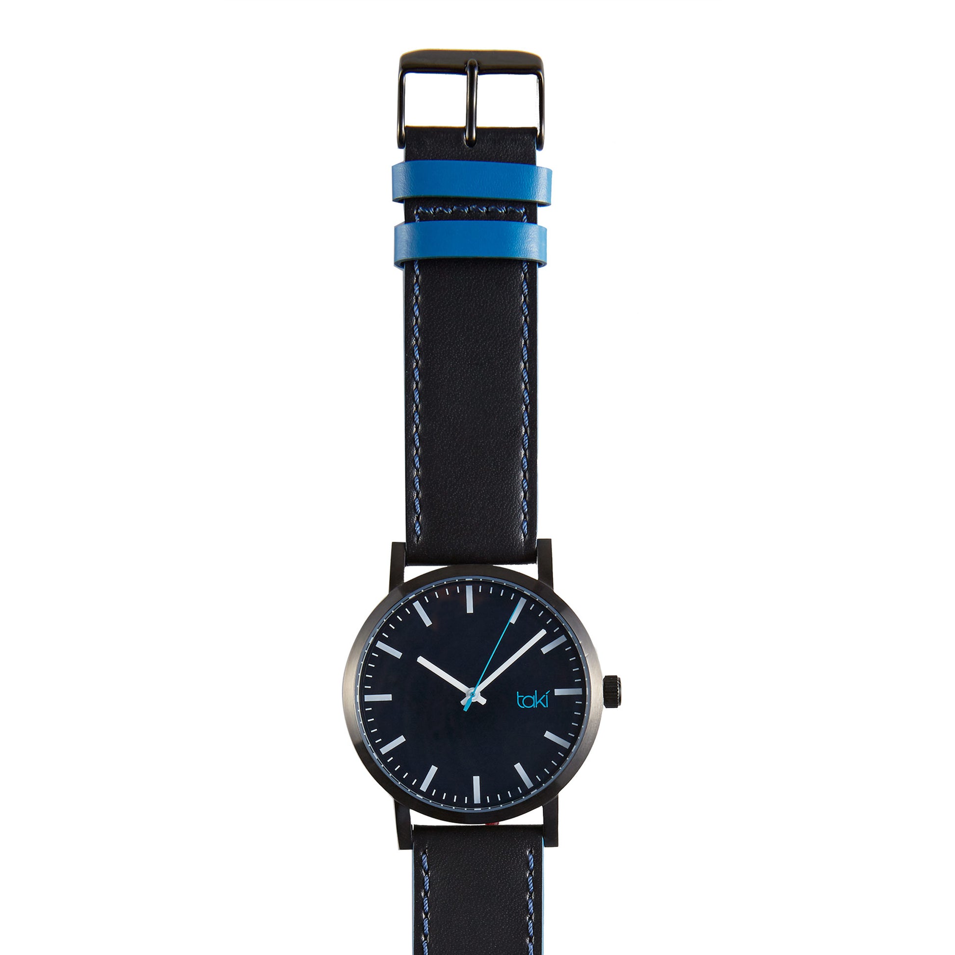 The original Taki watch, the Hugo collection features our signature minimalist dial and hour marker design, bright pops of color, and black brushed case and buckle detailing. The thick case, unique color combinations, and accented second hand and logo creates an overall minimal look with a lot of personality.