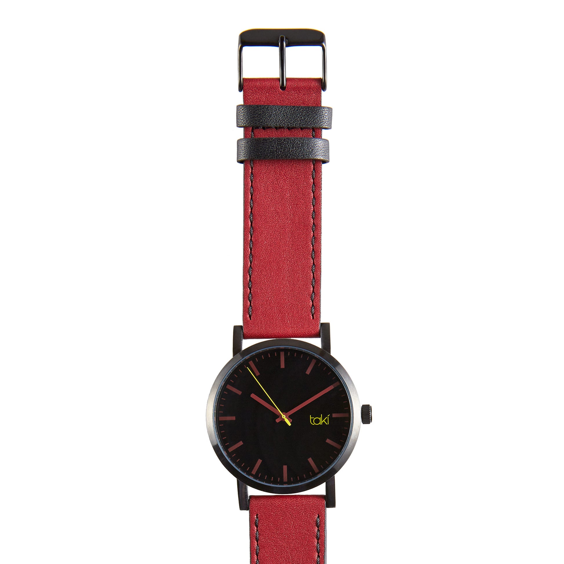 The original Taki watch, the Hugo collection features our signature minimalist dial and hour marker design, bright pops of color, and black brushed case and buckle detailing. The thick case, unique color combinations, and accented second hand and logo creates an overall minimal look with a lot of personality.