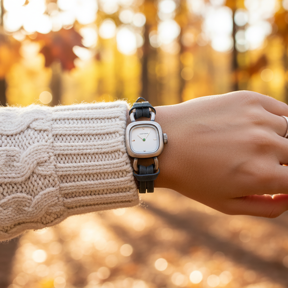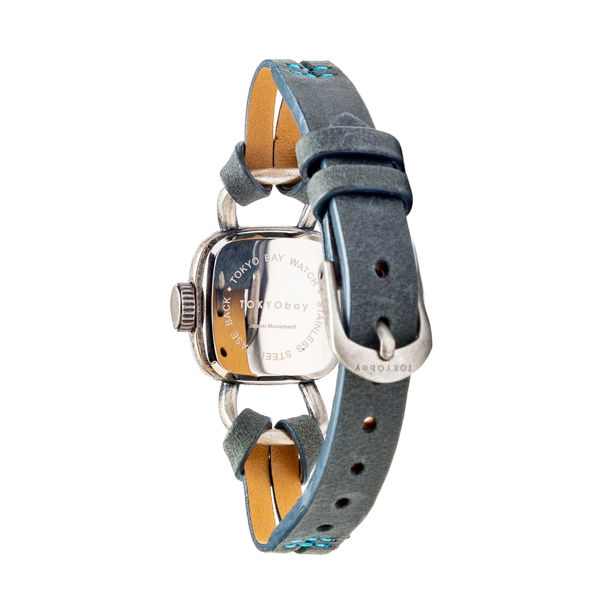 Lane features include a simple, minimally detailed dial and an antique finished case. A delicately looped matte leather band with accent stitching completes the look on this unique watch.