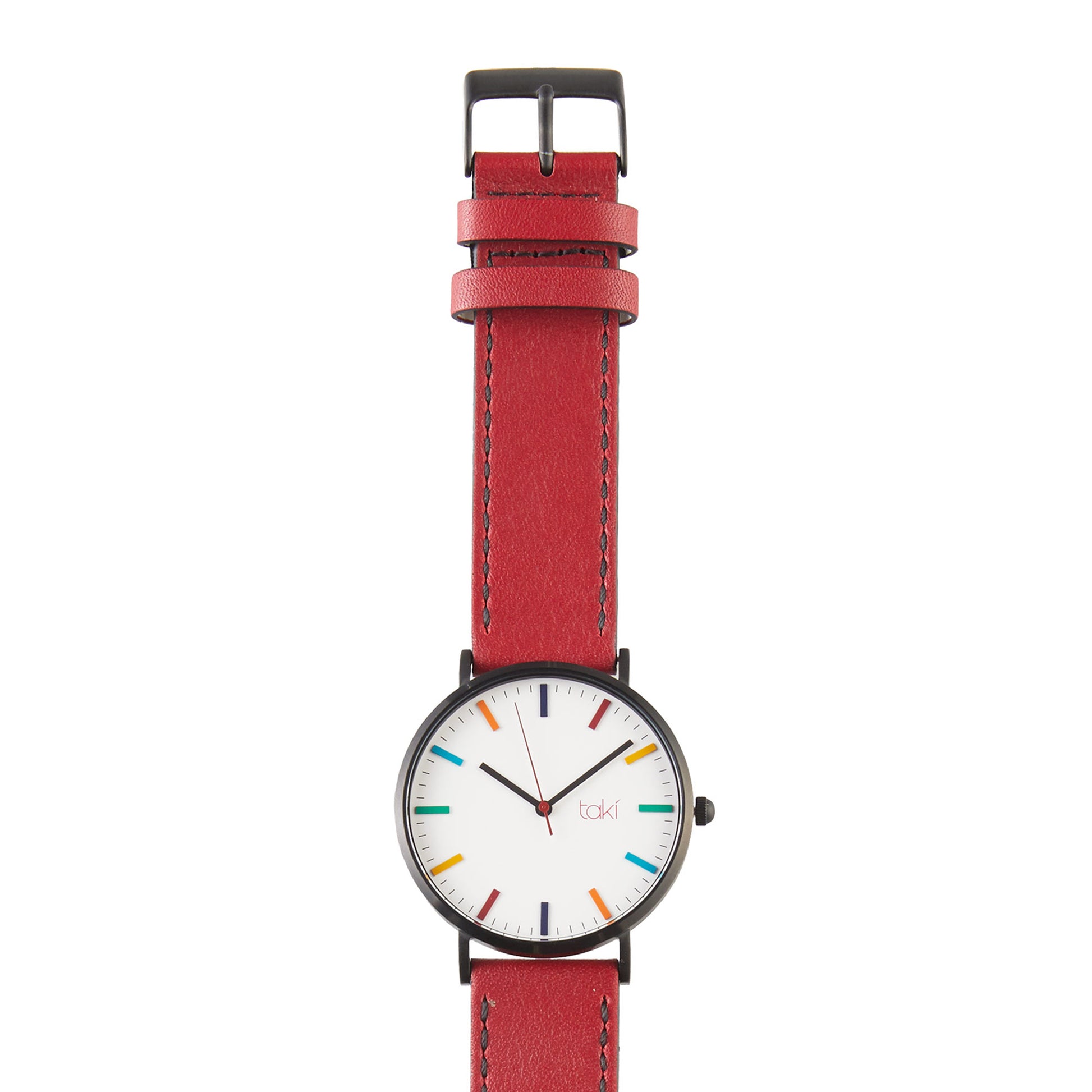 The Linden collection features unique raised hour markers in multiple bright colors embodying what Taki does best - minimalist design with a dose of color. Includes our signature brushed black case and accented second hand.