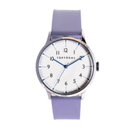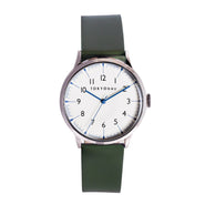 A modern and clean styling with an over sized polished silver case and neutral color palette. The full numbered dial design and elongated index at each hour has a retro feel, and is countered with a simple cut edge band in smooth leather. An extra color hit of blue to the handset pulls this classic into an everyday fashion staple. Sized as unisex.
